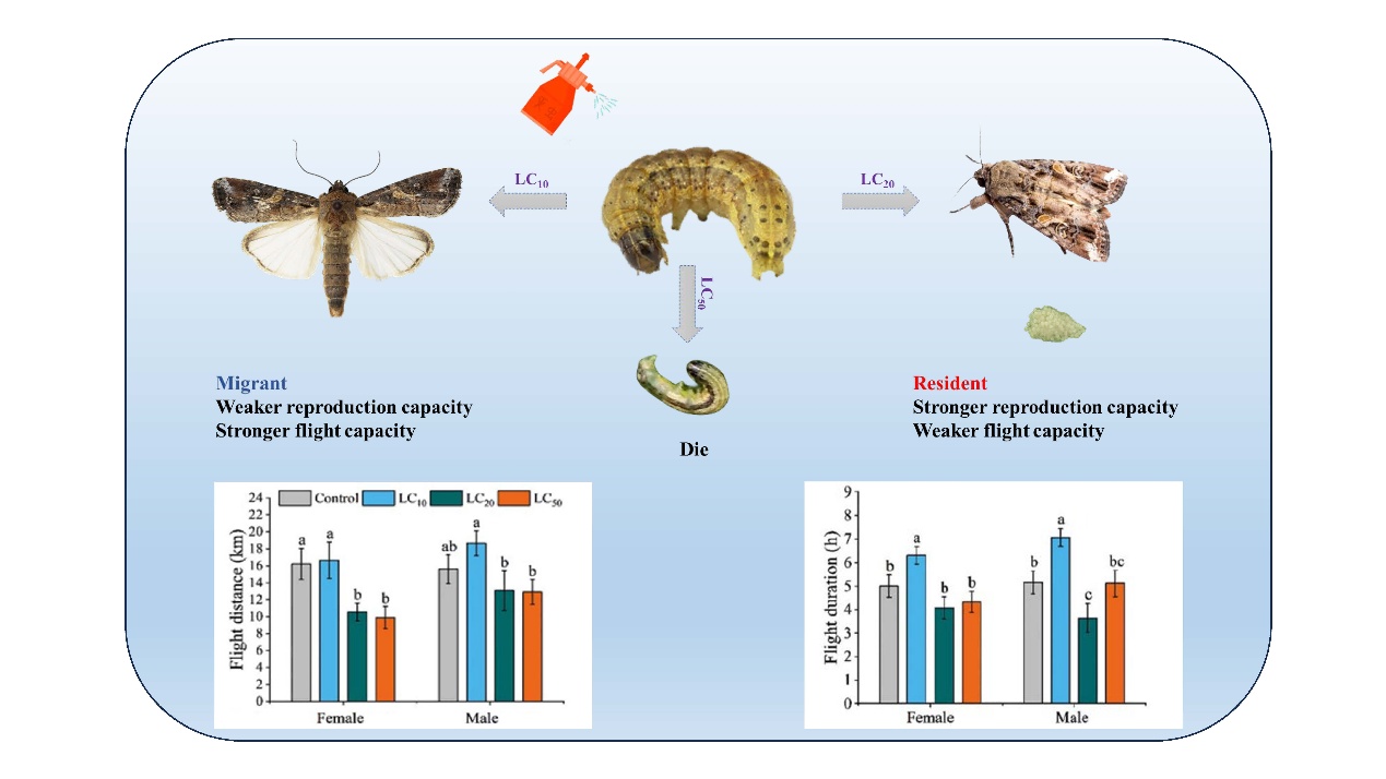 该研究系统评估了亚致死浓度氯虫苯甲酰胺对草地贪夜蛾发育、繁殖及飞行能力的影响,进而从分子层面阐明其调控机制。研究发现,草地贪夜蛾通过灵活调整迁飞-生殖权衡来应对不同浓度氯虫苯甲酰胺的胁迫压力,揭示了由卵黄原蛋白和脂动激素基因介导的适应性分子机制,为优化田间农药使用、控制害虫再猖獗提供了新思路。