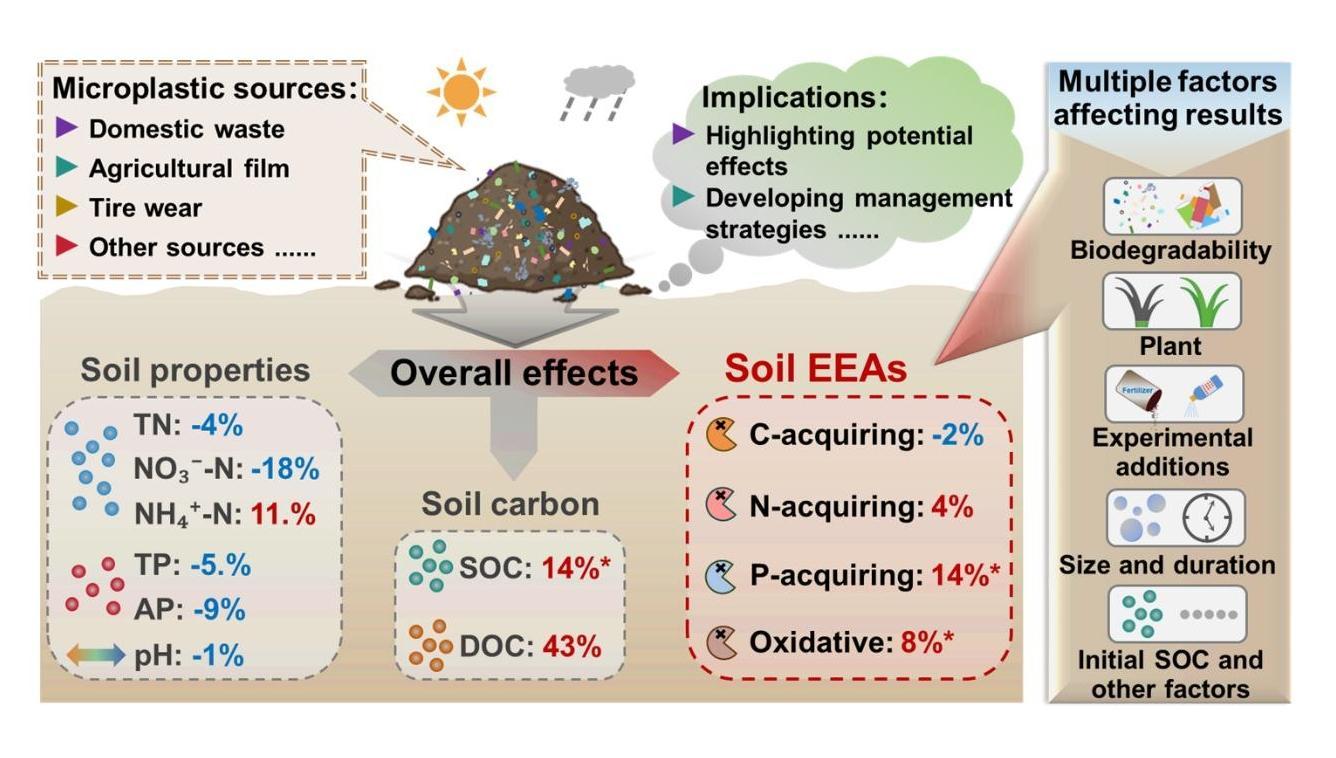 团队研究发现,微塑料总体上增加了土壤氮、磷获取酶和氧化酶活性,而抑制了碳获取酶活性。生物降解微塑料较非生物降解微塑料对土壤胞外酶活性有更为明显的促进作用。此外,微塑料颗粒大小是影响土壤碳、氮获取酶活性的主要因素,土壤初始有机碳含量和试验持续时间分别是影响土壤磷获取酶和氧化酶活性的主要因素。研究结果为深入理解微塑料对土壤功能造成的生态风险提供了科学依据,也为制定陆地生态系统的污染防控与土壤可持续管理策略提供了理论支撑。