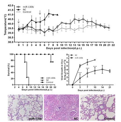 Recently, the lab of swine reproductive infectious diseases led by Dr. Tong Guangzhi at the Shanghai Veterinary Research Institute (SHVRI) of Chinese Academy of Agricultural Sciences (CAAS) identified miR-130b as a novel Porcine reproductive and respiratory syndrome virus (PRRSV) suppressor in vitro and in vivo. This finding has been published in the Scientific Reports on Nov. 19 2015 available here: http://www.nature.com/articles/srep17010 .