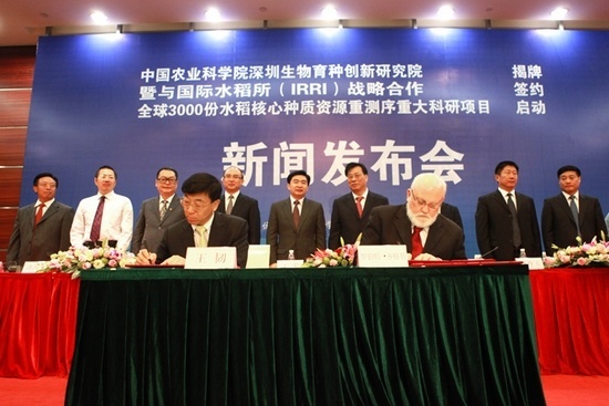 A project that aims to re-sequence 3000 rice core germplasms collected around the world was launched in Shenzhen in November 15, marking the start of research on whole-genome-based molecular breeding of rice in China. Dr. WANG Ren, Vice-President of CAAS and President of Shenzhen Institute of Breeding and Innovation (SIBI) of CAAS, and Dr. Robert Zeigler, Director General of International Rice Research Institute (IRRI) signed the framework agreement on strategic cooperation between SIBI and IRRI.