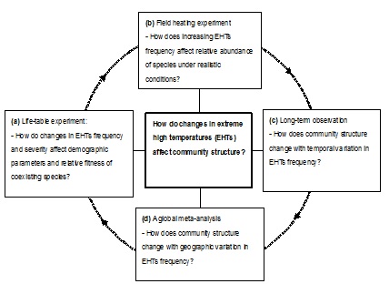 Figure 1 Four complementary approaches used in this study to determine how changes in extreme temperature events (EHTs) will affect structure of natural communities