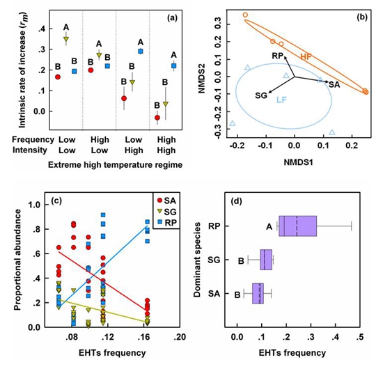Figure 2 Changes in (a) relative fitness with experiment regimes, (b) community structure with field warming, (c) proportional abundance with EHTs frequency in a 6-year field survey, and (d) dominant species with EHTs frequency at a global scale