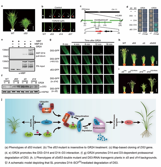 With the discovery of strigolactones (SLs) as root exudate signals that trigger parasitic weed seed germination, and then as a branching inhibitor, a newly discovered class of carotenoid-derived phytohormones, the next phase of SL research has quickly revealed this hormone class as a major player in optimizing plant growth and development. Despite the rapid progress in elucidating the SL biosynthetic pathway, the perception and signaling mechanisms of SL remain poorly understood. Here, they find that the rice (Oryza sativa) d53 mutant is caused by a gain-of-function mutation and is insensitive to exogenous SL treatment. The D53 gene product can form a complex with DWARF 14 (D14) and DWARF 3 (D3), two previously identified signaling components potentially responsible for SL perception. They demonstrate that, in a D14- and D3-dependent manner, SLs induce D53 degradation by the proteasome and abrogate its activity in promoting axillary bud outgrowth.