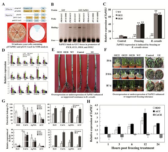 TaPIE1, as an activator-type ERF transcription factor, preferentially binds to the GCC-box cis-elements in promoters of defense and stress-responsive genes (Fig. A and B). R. cerealis and freezing challenges enhanced the transcript level and transactivation activity of TaPIE1 (Fig. C), which activated the expression of TaPIE1-activated defense- and stress-responsive genes (Fig. D), leading to enhanced resistance to both stresses (Fig. E and F). Ethylene positively regulated TaPIE1-mediated responses (Fig. G and H). This study firstly reported the coordinated regulation and underlying mechanism of a wheat ERF transcription factor in responses to pathogen R. cerealis and freezing stresses, which laid the foundation for molecular breeding for R. cerealis resistance.