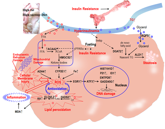 This study examined the development of metabolic syndromes in Bama minipigs fed a high-fat high-sucrose diet (HFHSD) for 23 months using histological, serum and profiling the gene expression patterns of the livers from HFHSD pigs as compared to the controls. Pathology findings revealed microvesicular steatosis, iron overload, arachidonic acid synthesis, lipid peroxidation, reduced antioxidation capacity, increased cellular damage, inflammatory in the liver. RNA-seq analysis revealed that 164 genes were differentially expressed between the livers of the HFHSD and control groups. The pathogenesis characteristic of NASH in early stage exhibited as, hyperinsulinemia promoted the de novo synthesis of fatty acids and nascent triglyceride, which were deposited as lipid droplets in the hepatocytes. Hyperinsulinemia shifted the energy supply from glucose to ketone bodies, and the high ketone body concentration induced overexpression of cytochrome P450 2E1 (CYP2E1). The iron overload and CYP2E1 and alcohol dehydrogenase 4 overexpression mediated reactive oxygen species (ROS) production, which resulted in arachidonic and linoleic acid peroxidation, leading to malondialdehyde production, and a cellular response to ROS-mediated DNA damage.