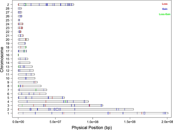 Locations of the high confidence CNVRs in BJY chickens are indicated by marks on the lines on the chromosomes.