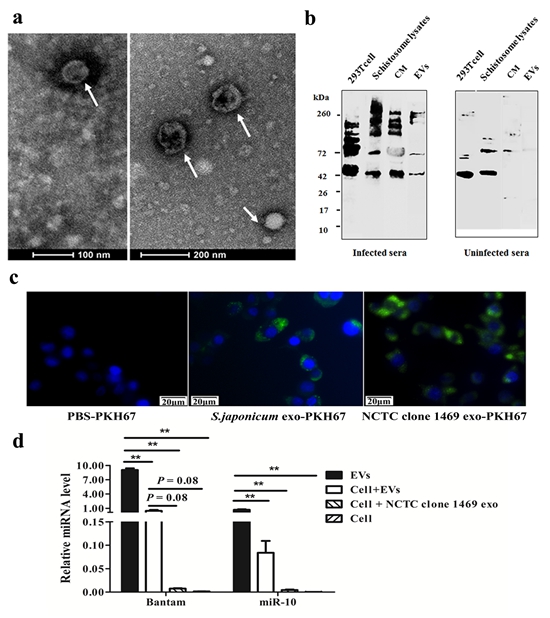 Secreted extracellular vesicles play an important role in pathogen-host interactions. Increased knowledge of schistosome extracellular vesicles could provide insights into schistosome-host interactions and enable the development of novel intervention strategies to inhibit parasitic processes and lessen disease transmission. In this study, researchers report on the biochemical characterization of S. japonicum EVs by using LC-MS/MS and small RNA sequencing. A total of 403 proteins were identified in S. japonicum EVs, and bioinformatics analyses indicated that these proteins were mainly involved in binding, catalytic activity, and translation regulatory activity. Further studies demonstrated that mammalian cells could internalize S. japonicum EVs and transfer their cargo miRNAs to recipient cells. Additionally, a specific miRNA, likely originating from a final host, ocu-miR-191-5p, is identified in S. japonicum EVs. The research demonstrated that S. japonicum EVs could be implicated in the pathogenesis of schistosomiasis via a mechanism involving the transfer of their cargo miRNAs to hosts. These findings provide novel insights into the mechanisms of schistosome-host interactions.