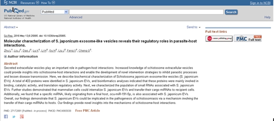 Recently, the animal schistosomasis innovation research group led by Prof. Guofeng Cheng at Shanghai Veterinary Research Institute of Chinese Academy of Agricultural Sciences (CAAS) found that S. japonicum exosome-like vesicles (S. japonicum EVs) are involved in the regulation of parasite-host interactions. This finding was published in the Scientific Reports in May 2016.