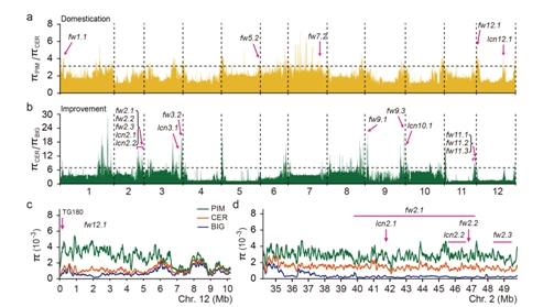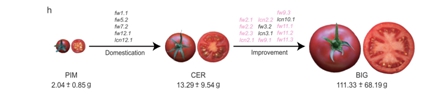 To study the history of tomato breeding including domestication and improvement, they analyzed 330 red fruited accessions including Solanum pimpinellifolium (PIM), S. l. var. cerasiforme (CER), and S. lycopersicum (BIG), which represent wild, improved and currently cultivated tomatoes, respectively. At the whole genome level, the nucleotide diversity of PIM (3.23×10-3) is substantially higher than that of CER (1.74×10-3) and BIG (0.73×10-3). By scanning genomic regions with a drastic reduction of nucleotide diversity between PIM and CER (πPIM/πCER, domestication sweeps) as well as between CER and BIG (πCER/πBIG, improvement sweeps), they identified 186 domestication (occupying 64.6 Mb, 8.3%) and 133 improvement sweeps (occupying 54.5 Mb, 7.0%) of the assembled genome. This team revealed the evolutionary path of how modern tomato fruit have become ~100 times larger than their ancestor. Five QTLs related to fruit mass are contributed to the enlargement of tomato fruits during the evolutionary transition from PIM to CER and 13 QTLs are contributed the second round of fruit enlargement during the transition from CER to BIG.