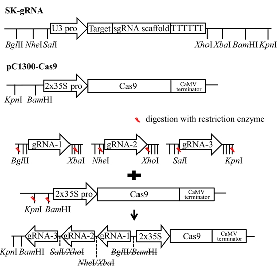 Recently, researchers from China National Rice Research Institute (CNRRI) of Chinese Academy of Agricultural Sciences (CAAS) and Yangzhou University developed a simple system to generate multiple mutations in rice by co-expression of Cas9 protein and multiple gRNAs targeting different genomic loci. By rapid construction of the vectors and a single transformation, multiple genes were mutated with high-efficiency. Further statistical analysis revealed that mutations tend to occur simultaneously and different targets showed different proportions of mutation types in the transgenic plants, indicating different sgRNAs function independently of each other. Thus, the establishment of CRISPR-Cas9 vector system allows convenient generation of rice carrying mutations in multiple genes, thereby facilitating both basic research and crop improvement.