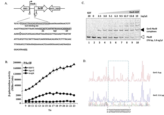 The study showed that A SigK consensus sequence is present upstream of genes encoding hair-like nap proteins (bclA and bclB), basal layer proteins (bxpA, bxpB, cotB, and exsY), and inosine hydrolase (iunH). Mutation of sigK decreased the transcriptional activities of all these genes, indicating that the transcription of these genes is controlled by SigK. Furthermore, mutation of gerE decreased the transcriptional activities of bclB, bxpB, cotB, and iunH but increased the expression of bxpA, and GerE binds to the promoters of bclB, bxpB, cotB, bxpA, and iunH. These results suggest that GerE directly regulates the transcription of these genes, increasing the expression of bclB, bxpB, cotB, and iunH and decreasing that of bxpA.