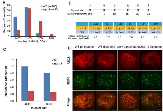 Recently, researchers from China National Rice Research Institute (CNRRI) of CAAS found that partial loss-of-function of the rice synaptonemal complex (SC) component ZEP1 reduced the strength of genetic interference and increased the genetic recombination frequency. Further cytological and double-mutant analyses implied that those additional COs were derived from the class I pathway. Taken together, the results support the enduring controversial hypothesis that the SC has universal roles in mediating interference and limiting COs. In addition, the zep1-3 mutant retained substantial fertility, so it is very likely that the mutant could be used directly to elevate genetic variation during rice breeding. As the SC is universal among crop plants, the results could also be of great interest for the breeding of other crop plants.