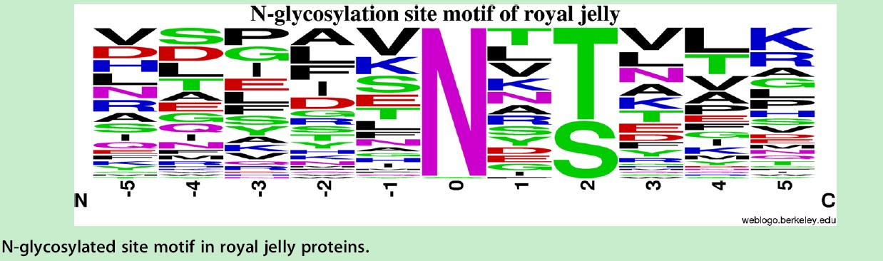 Digging out functional proteins that exist in royal jelly is a persistent pursuit for apicultural researchers. With a total of 32 protein identified, IAR’s team has identified the largest number of novel protein in royal jelly in the world so far. At same time, they also discovered 25 glycosylated proteins in royal jelly and mapped 42 new glycosylated sites onto royal jelly proteins using the glycoproteomics strategy. These findings represent a crucial step toward systematically revealing the functionality of N-glycosylated royal jelly proteins, and are potentially useful for producing a protein with desirable pharmacokinetic and biological activity using a genetic engineering approach.