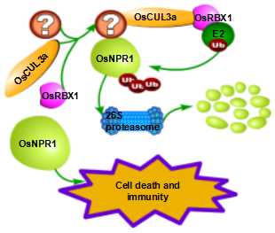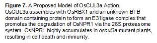 The ubiquitin/proteasome pathway is a major system for the selective degradation of proteins in eukaryotes. Previous studies in plants have demonstrated that the ubiquitin/proteasome pathway is an essential component of the regulatory networks controlling many important cellular processes, including growth and development, as well as defense responses. Among the three major enzymes in this pathway, the E3 ubiquitin ligases are responsible for controlling the specificity of target protein recognition and degradation via the 26S proteasome. A prominent subset of the E3 ligases are the Cullin-RING E3 ligases (CRLs), in which the Cullin3 (CUL3)protein is known to function in the regulation of PCD in animals. In plants, the transcription coactivator NPR1 (NONEXPRESSOR OF PATHOGENESIS-RELATED GENES 1) is a master regulator of both basal and systemic acquired resistance (SAR). OsNPR1 over-expression rice plants have enhanced resistance to the bacterial pathogen Xanthomonas oryzae pv. Oryzae (Xoo), elevated expression levels of pathogenesis-related (PR) genes, and a benzothiadiazole-mediated cell death phenotype. Although OsNPR1 has been identified as a positive regulator of resistance against bacterial pathogens, its protein turnover and molecular mechanism remain largely unknown.