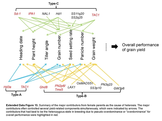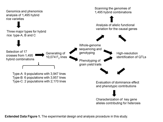 Their research included generating, sequencing and recording the phenotypes of 10,074 F2 lines from 17 representative hybrid rice crosses. The large data of genomics and phenomics from the well-designed populations enabled us, for the first time, to identify the genetic contributors comprehensively and find out the exact causes of heterosis. Through the analysis of their research result, modern rice varieties can be classified into three major types, representing different hybrid breeding systems. Although they do not find any heterosis-associated loci shared across all lines, within each group, a small number of genomic loci from female parents explain a large proportion of the yield advantage of hybrids over their male parents. For the individual yield components, the heterozygous state of the heterosis-related genes generally acted through the way of dominance complementation. The hybrids with yield heterosis resulted from an optimal combination of multiple yield-related components, meaning better performance of overall yield in crop productions. The results of this study have elucidated the genetic mechanism of heterosis in rice, which is of great significance in promoting accurate molecular design breeding in rice.