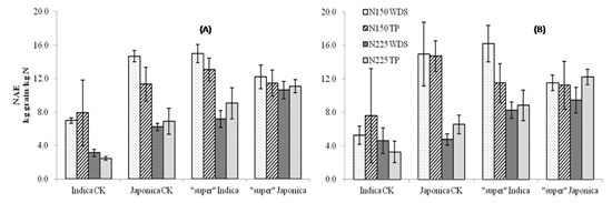 In the Japonica group, more N was accumulated in super rice than in CK at N225, but no difference was found between super and CK varieties at N0 and N150. Similar results were also found for N agronomic efficiency. The results suggest that super rice varieties have an advantage for N-use efficiency when high N is applied. The response of super rice was greater under TP than under WDS. The results suggest that the need to further improve agronomic and other management practices to achieve high yield and N-use efficiency for super rice varieties in WDS.