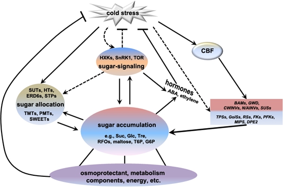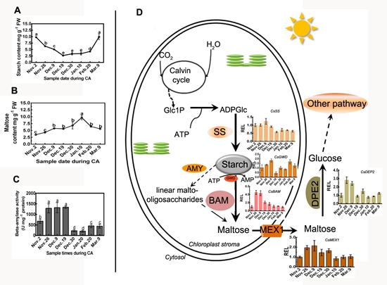 Carbohydrates, especially of soluble sugars, play an essential role in plant cold tolerance; however, the molecular regulation of tea plant in response to cold is unclear. Recently, the researchers investigated the physiological changes including sugar contents and ultrastructure alterations in tea plants during CA, indicted that the content changes of sugar (e.g. starch, and sucrose) were correlated with the cold-tolerance of tea plants. They observed that CA induced starch degradation, which was responsible for the increase of soluble sugar content contributed to tea plants tolerance to cold. Additionally, more than 59 genes involved in the sugar metabolism, transportation, and signaling pathways were isolated, and their expression profiles were also detected over the course of a consecutive two-year assay in the winter seasons from 2012 to 2014. These results provided a comprehensive insight into the effects of CA on carbohydrates indicating that sugar accumulation contributes to tea plant cold tolerance during winter season, and a simply model of sugar regulation in response to cold stimuli is proposed.