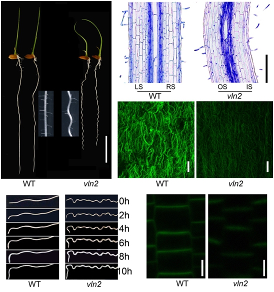 To investigate the molecular mechanisms governing the assembly of plant architecture in rice, a mutant, designated as villin2 (vln2), was isolated by the team. vln2 displays organ malformations, such as twisted roots and shoots. Microscopy analysis revealed that the twisted mutant phenotype is caused by asymmetrical cell expansion on the opposite sides of a given organ. vln2 was cloned and VLN2 encodes a villin-like protein that retains the overall molecular structure of villins with six conserved gelsolin repeats (G1 to G6) and a villin headpiece. They have shown that VLN2 is capable of bundling, capping, and severing actin filaments and plays an important role in bundling actin filaments in vivo. Furthermore, the team observed a more dynamic actin cytoskeleton, hypergravitropism, faster recycling of PIN2, altered auxin distribution pattern, and impaired polar auxin transport in vln2 roots, which may explain the twisted or undulated phenotype. Thus, they have established a genetic link between MF dynamics, auxin transport, and directed organ growth in rice.