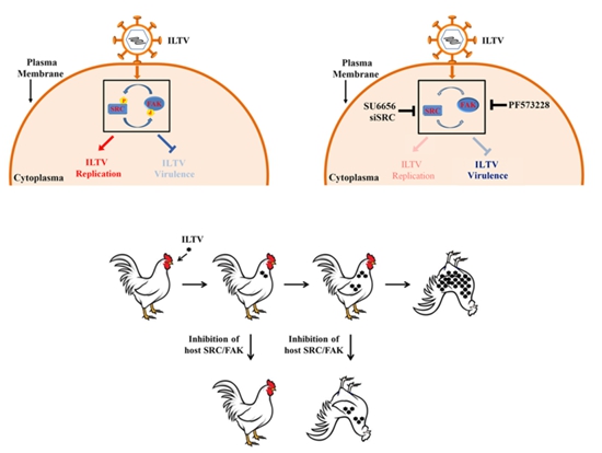 Infectious laryngotracheitis (ILT) is a major respiratory disease of chickens which could cause large economic losses to the poultry industry worldwide annually. Given the side effects of vaccination against ILT, novel strategies for ILT control and therapy are urgently needed. Using genome-wide transcriptome studies in combination with a bioinformatic analysis, Dr. Liu and his colleagues identified proto-oncogene tyrosine-protein kinase SRC (SRC) as an important modulator of ILTV infection. Their further studies revealed that SRC controls the virulence of ILTV through a positive feedback loop with the tyrosine kinase focal adhesion kinase (FAK). These results advance the current understanding of host-ILTV interactions on a molecular level, and provide experimental evidence that is possible to control ILT via the manipulation of host-virus interactions.