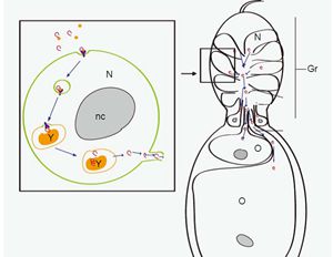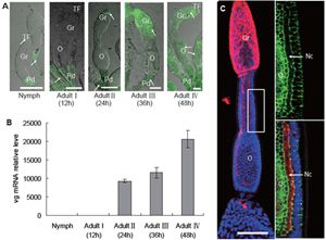 The researchers firstly obtained the vitellogenin which interacted with nucleocapsid protein of RSV by yeast two-hybrid. Accompanied by the expression of Vg, RSV appeared in the anterior part of germarium, then spread into most parts of the germarium and the ooecium. RSV and Vg colocalized with each other, forming some small colocalization spots in the germarium of the ovariole. With time, more colocalization spots of RSV RNPs and Vg gradually accumulated and enlarged and were finally distributed throughout the germarium of insects. It is obviously that Vg is an important component for RSV to overcome the transovarial transmission barrier. RNA interference suggested that the knockdown of vg expression specifically affected the accumulation of RSV in the ovariole of the insect. Based on all the data obtained, they proposed a model for the RSV transovarial transmission in L. striatellus. Above all, RSV binds to Vg outside the ovariole to form a complex. Then, the complex is transported into the nurse cells in the germarium via endocytosis. Finally, RSV in the nurse cells spread into the growing oocytes with or without binding with Vg through the nutritive cords. Taken together, RSV can use existing transovarial transport systems in female insects for its own purposes.