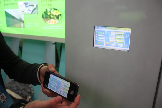 Researcher of the Institute of Environment and Sustainable Development in Agriculture of CAAS demonstrating the network of things between family digital plant factory and mobile phones