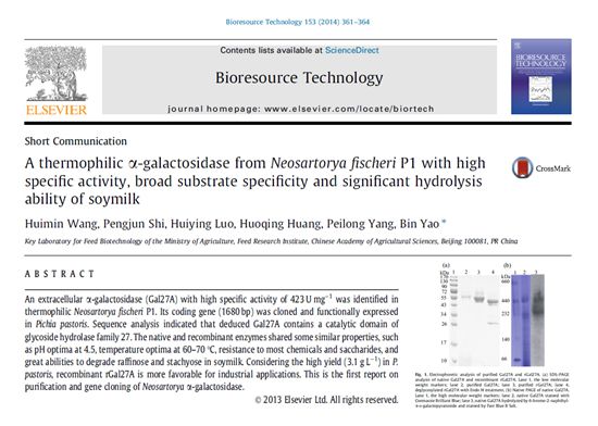 Dr. Yao bin, senior scientist of Feed Research Institute (FRI), Chinese academy of agricultural sciences (CAAS), led the enzymetic engineering research team to work on α-galactosidase and to clone novel α-galactosidase genes from the rmophilic microorganisms, to construct high-yield secretory engineering strains, and to provide cost-effective α-galactosidase candidates with excellent properties and high productivity for potential industrial application.