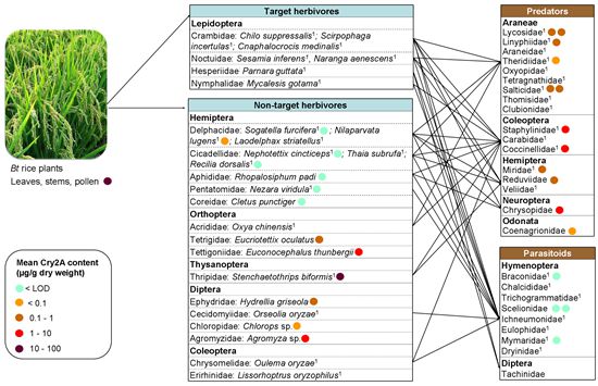 Simplified arthropod food web of rice in Central and Southern China and the content of plant-derived Cry2A protein in each arthropod species (other than target herbivores)