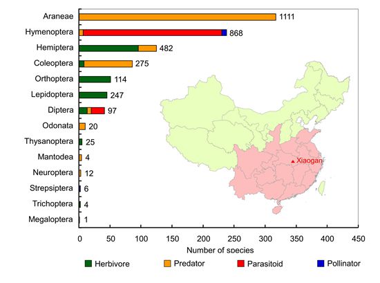 Numbers of arthropod species (sorted by order) recorded in the rice-planting regions of Central and Southern China (area indicated in red). Total numbers of records are indicated beside the bars.