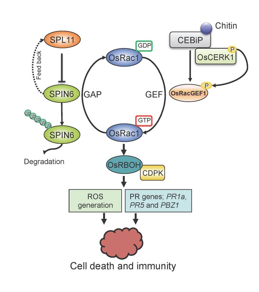 They previously characterized U-box type E3 ligase SPL11 in rice that is involved in the regulation of cell death and immune responses. However, how SPL11 interacts with its substrates to control cell death and immunity is still unknown. In this paper, they found that the SPL11 interacts with SPIN6 in vitro and in vivo. SPL11 ubiquitinates SPIN6 in vitro and degrades SPIN6 in vivo via the 26S proteasome-dependent pathway. Both the Spin6 RNAi and mutant plants lead to Program Cell Death and increased resistance to the rice blast pathogen Magnaporthe oryzae and the bacterial blight pathogen Xanthomonas oryzae pv. oryzae. Importantly, they found that SPIN6 is the RhoGAP of the small GTPase OsRac1, which is a key component in rice immunity. This study provides further insights into the relationship between SPIN6 and its interacting proteins SPL11 and OsRac1, and its function in the control of cell death and immunity in rice.