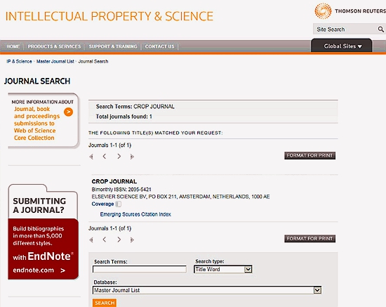 The Crop Journal is now indexed in Thomson Reuters Web of Science: Emerging Sources Citation Index (ESCI).