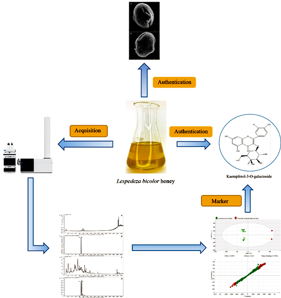 该研究测定并比较了胡枝子蜜与其他四种中国大宗蜂蜜(荆条蜜、椴树蜜、枣花蜜和洋槐蜜)的化学成分,筛选差异化合物中变量重要性投影(VIP)˃1的物质,并结合胡枝子中的化合物对其进行筛选,最终研究确定以山奈酚-3-O-半乳糖苷(学名:三叶豆苷)在90.2 ~ 430.1 微克/千克的浓度阈值作为胡枝子蜜的特异性标记。该研究为鉴别胡枝子蜜及进一步开发应用提供了理论依据。