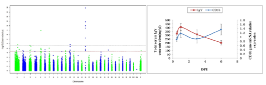 血清IgY全基因组关联分析曼哈顿图(左)和CD1b基因表达与IgY相关性分析(右)