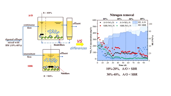在前期研发提出厌氧-加原水-间歇曝气工艺的基础上,团队研究人员进一步探究了两种工艺处理性能的差异及其机制。研究发现,在原水添加比例低于30%时,缺氧好氧工艺对氨氮和总氮的去除性能优于序批式反应器工艺,在原水添加比例达到30%后,序批式反应器工艺对氨氮和总氮的去除性能优于缺氧好氧工艺。造成这种差异的主要原因在于反硝化阶段易降解有机物浓度和混合液回流比不同而造成反应动力学差异,序批式反应器工艺污泥的氨氧化活性和厌氧氧化活性高,而缺氧好氧工艺污泥的反硝化活性高。该研究成果为猪场废水处理工艺选择提供了科学依据。