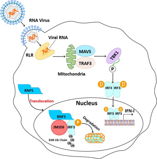 天然免疫是宿主防御病毒感染的第一道防线,在RNA病毒感染时,宿主细胞模式识别受体RIG-I或MDA5识别病毒RNA,激活宿主细胞产生一系列信号级联反应。干扰素调节因子3(IRF3)活化是系列信号级联反应中的关键一步。IRF3活化能促进下游I型干扰素(IFN-I)和促炎细胞因子大量分泌,抑制并清除入侵的病毒。然而,IRF3的持续活化则会导致宿主细胞受损,诱发自身免疫性疾病。因此,精准调控IRF3活化对深入解析天然免疫调控机制具有重要意义。