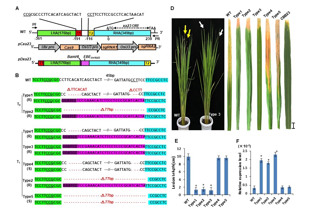该研究利用CRISPR/Cas9介导的同源重组技术把监测病原菌的启动子元件定点插入到原本感白叶枯病的水稻品种的基因组中,创制出了对供试的20个白叶枯病菌小种全部高抗的基因编辑株系,证明了可以在一年内(两个世代)将一个“感病品种”转变成广谱高抗白叶枯病的水稻品种,而且原品种的株高、旗叶长宽、穗数、穗长、结实率、千粒重、单株产量等性状不受影响。这是对水稻白叶枯病抗性优异基因Xa23和新兴的基因组编辑技术在水稻改良中应用的重大扩展,为有效利用重要的基因核心元件提供了模型。