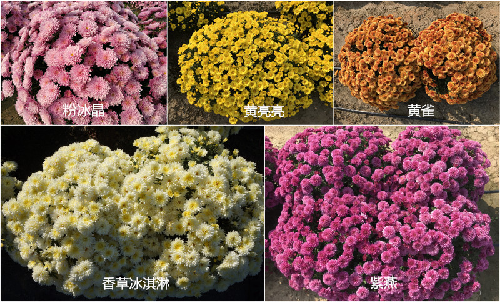 5个菊花品种属于地被小菊系列,其中,“粉冰晶”花型独特、花色绚丽可作盆栽;“黄亮亮”“紫燕”综合抗性强可用作宿根栽培,近年来已推广到北京、内蒙古、宁夏、新疆、福建等地。
