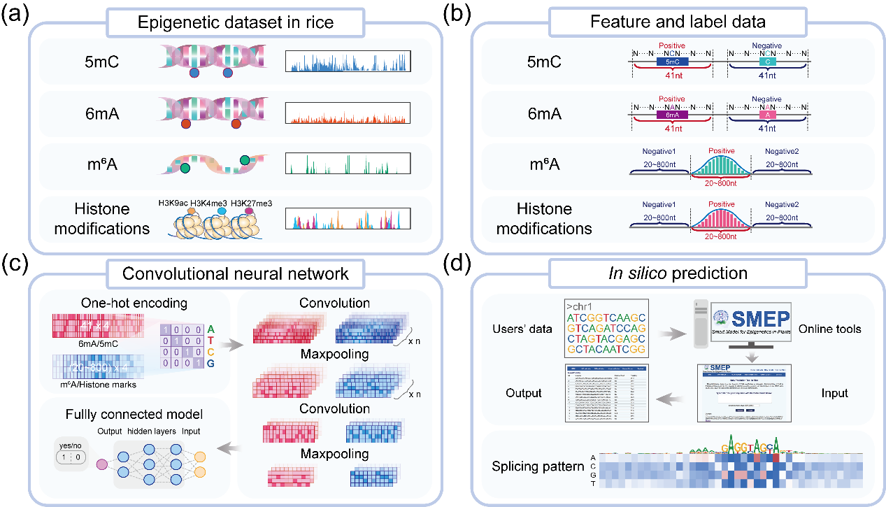 目前,人工智能技术在表观组学大数据分析和预测上展现广阔的应用潜力。该研究基于卷积神经网络方法,利用课题组前期绘制粳稻日本晴的多种表观修饰图谱,构建得到了具有高准确度的智能预测模型(SMEP)。该模型经过参数优化、交叉验证以及实验验证,SMEP在预测DNA甲基化、RNA甲基化和组蛋白修饰等表观遗传修饰位点中具有高可信度。同时,该研究还成功地将SMEP模型应用于籼稻代表品种93-11及玉米品系B73中表观修饰位点的预测。由于SMEP预测了大量正常实验条件下检测不到的位点,团队进一步通过热激胁迫处理实验,验证了SMEP预测的特异地响应热激反应的6mA修饰位点,表明SMEP预测的表观修饰位点可能参与多种环境响应。最后,在线构建了SMEP智能预测工具,提供了检索表观遗传修饰位点和基因表达数据的可视化界面供用户参考使用,为水稻、玉米等物种的重要农艺性状智能设计提供挖掘工具和数据支撑。