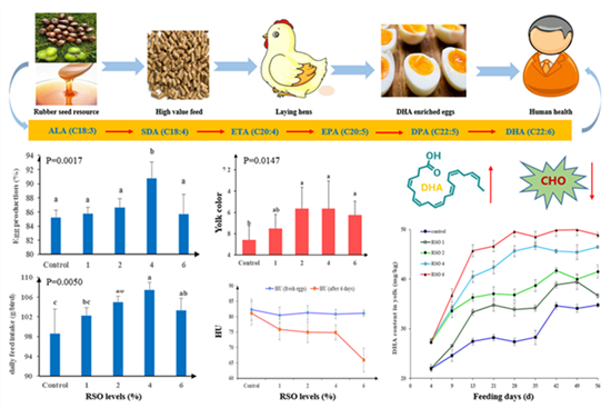 近日,中国农业科学院饲料研究所新型饲料资源研究与利用创新团队在橡胶籽资源挖掘与高价值利用技术方面取得新进展,探讨了橡胶籽油在降低鸡蛋胆固醇和提高鸡蛋ω-3不饱和脂肪酸含量的应用效果,建立了鸡蛋DHA水平随橡胶籽油添加的动力学模型,为未来橡胶籽油作为新型饲料资源在功能性蛋品开发上奠定了基础。相关研究成果在线发表在《食品化学(Food Chemistry)》上。