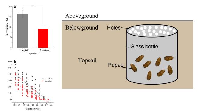 越冬能力和耐寒性在很大程度上决定了入侵物种的地理分布,低温适应性还可以通过时间和物候差异影响入侵物种和当地物种之间的竞争取代。为了预测三叶斑潜蝇在我国北方地区的定殖潜力。该团队在我国北纬30°-38°范围内分别在沿海和内陆各选择了8个试验地点,模拟斑潜蝇的自然越冬环境和越冬过程,连续多年在选择的试验地点进行了两种斑潜蝇的越冬存活试验。同时进行系统的室内试验,详细比较了两种斑潜蝇的低温耐受性、低温存活率、最低致死温度、过冷却点等耐寒能力。