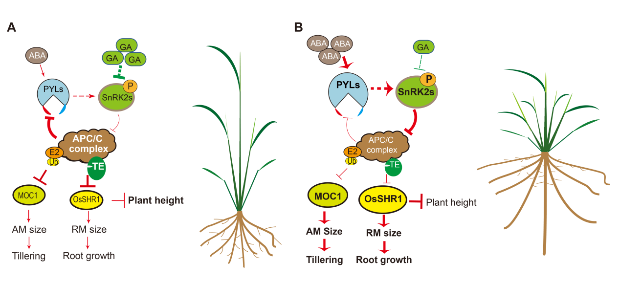 水稻株型是与产量密切相关的重要农艺性状,受到极其复杂的分子网络调控,迄今仍有诸多未解之谜。该团队早期研究发现,水稻分蘖抑制基因Tiller Enhancer (TE)编码APC/CTE E3泛素连接酶复合体的一个激活子,能够通过介导水稻分蘖关键促进因子MOC1的降解,进而抑制水稻的分蘖。且TE通过介导脱落酸受体PYL/PYR/RCAR的降解,来介导赤霉素对脱落酸信号途径的拮抗。另外,现有研究已经清楚,脱落酸是一种胁迫反应植物激素,它通过抑制种子萌芽及幼苗生长来适应不利的环境条件,而赤霉素是一种重要的促生长植物激素,可促进种子萌发、幼苗生长、开花和叶片伸展,尽管赤霉素和脱落酸拮抗调控植物的许多生长发育过程,但是赤霉素和脱落酸如何拮抗调控根发育和植物分枝(分蘖)的分子机制仍不清楚。