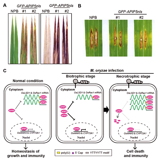 此次研究发现核定位信号的突变抑制了APIP5在水稻细胞核中积累,诱导细胞死亡的发生和增强对稻瘟菌的抗性。APIP5在水稻发育后期在细胞核中的积累增加,结合细胞壁相关激酶和细胞色素酶基因的启动子,并抑制二者的表达。这两个靶标基因分别通过调节木质素的积累和次级代谢物合成以及活性氧爆发正调控水稻基础免疫反应。有趣的是,APIP5还具有结合RNA的活性,稻瘟菌侵染促进其在细胞质RNA加工小体中的富集,特异性地结合两个水稻抗病和细胞死亡相关基因的mRNA序列促进其降解,在转录后水平调控水稻基础免疫反应。因此,该研究揭示植物转录因子通过在细胞核和细胞质中穿梭协同调控免疫反应的新机制,为水稻病害防控策略的开发提供新思路。
