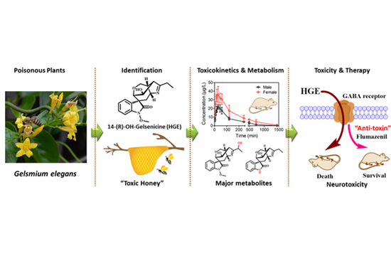 我国南方部分省市山区长期以来存在因食用蜂蜜而引发的群体性中毒事件,并导致多人死亡。蜂蜜中毒事件不仅危害了蜂蜜消费者的健康权益,而且严重阻碍了蜂产品行业的健康发展,特别是成为我国南方部分贫困地区发展中蜂产业的“拦路虎”。为摸清我国蜂蜜中毒的高风险地区和季节,该团队在全国范围内开展了有毒蜜源植物的调查和研究,结果发现钩吻是导致我国华南地区蜂蜜中毒的重要有毒蜜源植物之一。为了探究钩吻有毒蜂蜜致人中毒的物质基础和毒性作用机制,研究人员采用先进技术对钩吻进行了详细研究,结果从中识别和鉴定出了4种钩吻生物碱,其中新发现的化合物14-羟基钩吻素己占到总生物碱的90%以上,是钩吻有毒蜂蜜致人中毒的关键化合物。随后,该研究系统地开展了该化合物在模式动物中的急性毒性、毒代动力学、药物代谢和毒性作用机制等研究。结果表明该化合物属于剧毒性化合物,其半数致死剂量为0.125 毫克/千克(体重);在机体内易于吸收且发生了广泛的代谢,生成众多代谢产物,而γ-氨基丁酸是其关键的毒性作用靶点。该项研究成果不仅将为我国有毒蜂蜜的风险管控提供科学依据,也为食用含钩吻蜂蜜中毒后的救治措施提供参考手段。