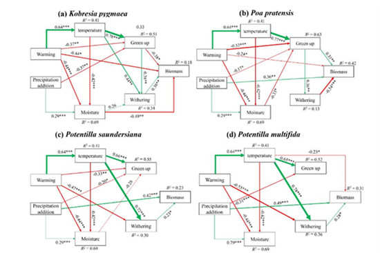 该研究通过长期野外原位模拟增温增水控制实验,观测了高寒草地优势植物物候期和生产力的变化。研究结果显示,在气候暖干年份,增温推迟植物物候期,而增水则使物候期提前。增温降低禾本科和莎草科优良牧草生产力,而增水对其具有正效应。植物物候期变化可以调控优良牧草生产力对气候变化的响应。研究发现,增温可以使早熟禾(Poa pratensis)推迟返青,使高山嵩草(Kobresia pygmaea)推迟枯黄;上述物候期变化对生产力具有正效应,但由于增温对其具有直接的负效应,因此两者间存在抵消作用。该研究结果明确了温度升高不利于高寒草地优良牧草生物量积累,但植物可通过改变其生长进程和生活史对策,尽量减少增温引起的负面影响。