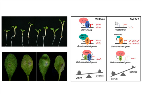 当生长在遮荫这种不利的生长环境下时,植物需要做出一个决定:生长还是防御?如何将有限的资源合理分配到2个相对的事件中,是植物面临的一个重要的抉择。过去的研究已发现遮荫情况下植物的快速生长受到光敏色素和多种激素的调控,但这些信号途径间的交互调控分子机制尚不清楚。研究人员发现光信号转导的重要因子FHY3和FAR1这2个蛋白在植物面临遮荫时生长和防御的平衡过程中发挥着重要作用。一方面,FHY3和FAR1蛋白直接调节避荫反应基因的表达水平,另一方面,可以与茉莉酸信号途径相互作用,从而抑制植物遮荫时的过快生长以及提高其防御能力,最终使生长和防御维持在一个适当的水平。